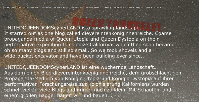 united queendoms colonize California is a series of 22 episodes (mostly videos) produced during a two-months journey/performative expedition in California in 2007. The production of the series and each episode itself are integral parts of the performance. The story is a collage of inhomogen narrative fragments created through driving (urban) landscapes and encounting people as "agents on location" who's own stories of mobility and migration carry forward the plot: "Are you on holidays?" – "No we are colonizing California".