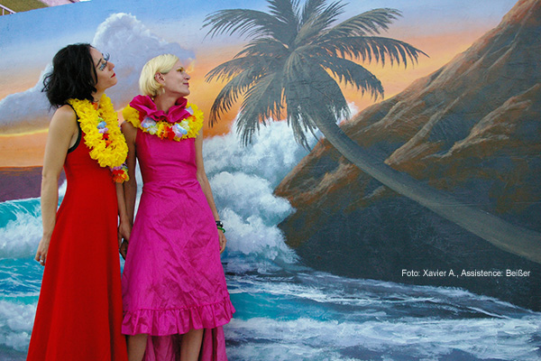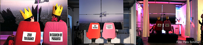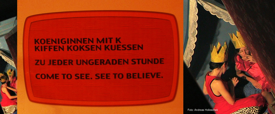 Utopia and Dystopia dress up (in quotes) and start out in search of paradise. Just as the rumours of glory show, the promised land lies westward. California! The destination, that – according to the european myth of the golden west and its reproductions in arts and science – represents the incarnated paradise. The destination is no outland to the queens. For many years they have lived secretly and watched TV. They have consumed this multi-variant and fitted (european, male, white, heterosexual) tradition and schooled themselves by media.